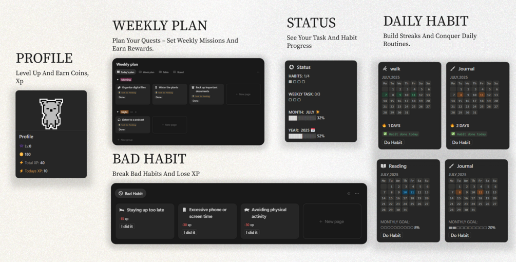 - Motivation Drought? Traditional habit trackers feeling dry and uninspiring? This template turns every completed habit into an achievement-unlocking adventure.