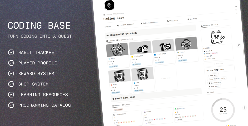 Master programming with interconnected systems that help you take notes, solve challenges, manage projects, and stay motivated with a full reward system and RPG-inspired progress tracking.