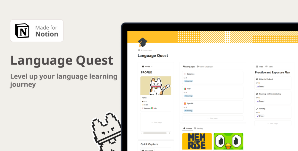 Language Quest is a powerful, all-in-one Notion dashboard designed to supercharge your language learning journey. Built with interconnected databases, it helps you stay organized, consistent, and motivated every step of the way.